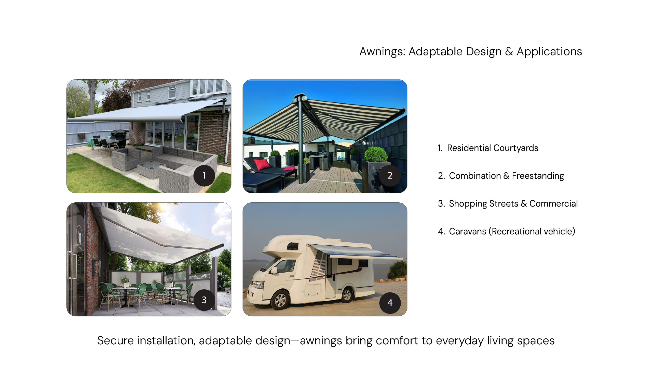 1. Residential Courtyards: Provides cozy shade and aesthetic appeal for private patios and balconies, extending the home's living space. 2. Shopping Streets & Commercial: Offers reliable weather protection for commercial storefronts, ensuring customer comfort and luxury branding. 3. Combination & Freestanding: Ideal for large, freestanding setups where multiple units can be combined to cover expansive outdoor areas. 4. Caravans: Adds convenience for RV use.