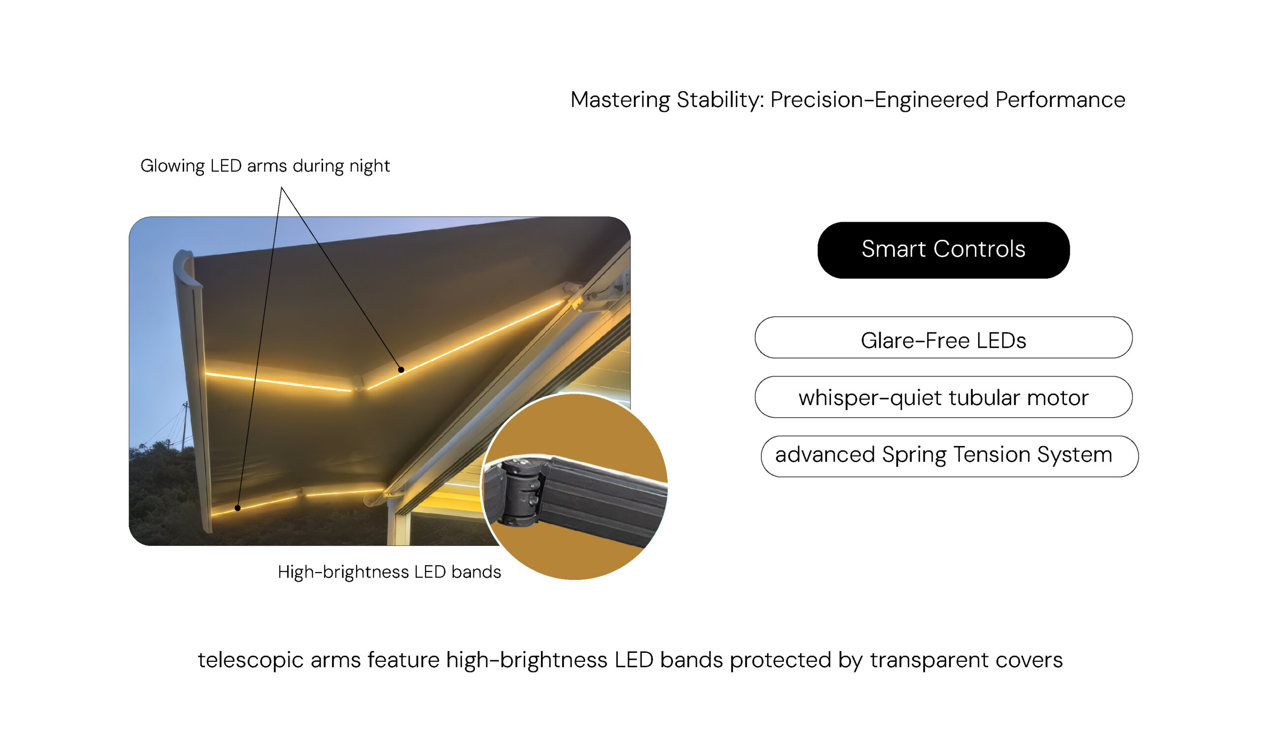 Enjoy your outdoor space day or night with our integrated LED lighting built directly into the telescopic arms. These high-brightness bands feature a transparent "anti-glare" cover to ensure the light is brilliant but never blinding. For ultimate convenience, the system is powered by a whisper-quiet tubular motor for wireless, one-touch operation. To ensure a premium look, our advanced Spring Tension System works behind the scenes to keep the fabric perfectly smooth and taut every time you extend it.