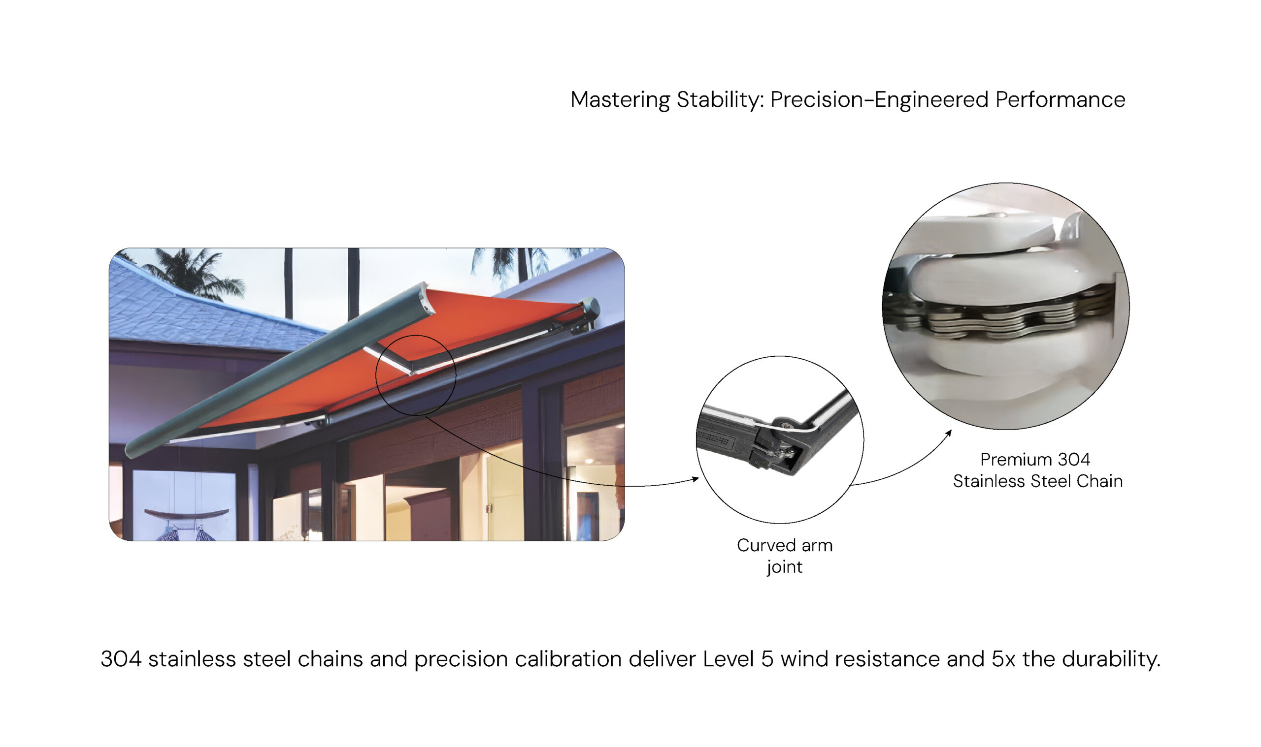 The 304 stainless steel chain is used at the joints of the curved arm instead of the original steel wire rope. This premium material has better abrasion resistance and provides a service life of up to 5 times longer than the original rope. Wind Resistance: Able to achieve wind resistance level 5. (Note: Rating is not stated for wooden structures or specific large/oversized awnings). Fabric/Projection Ratio: The width dimension must be greater than the projection dimension by 500mm to ensure optimal stability and performance.