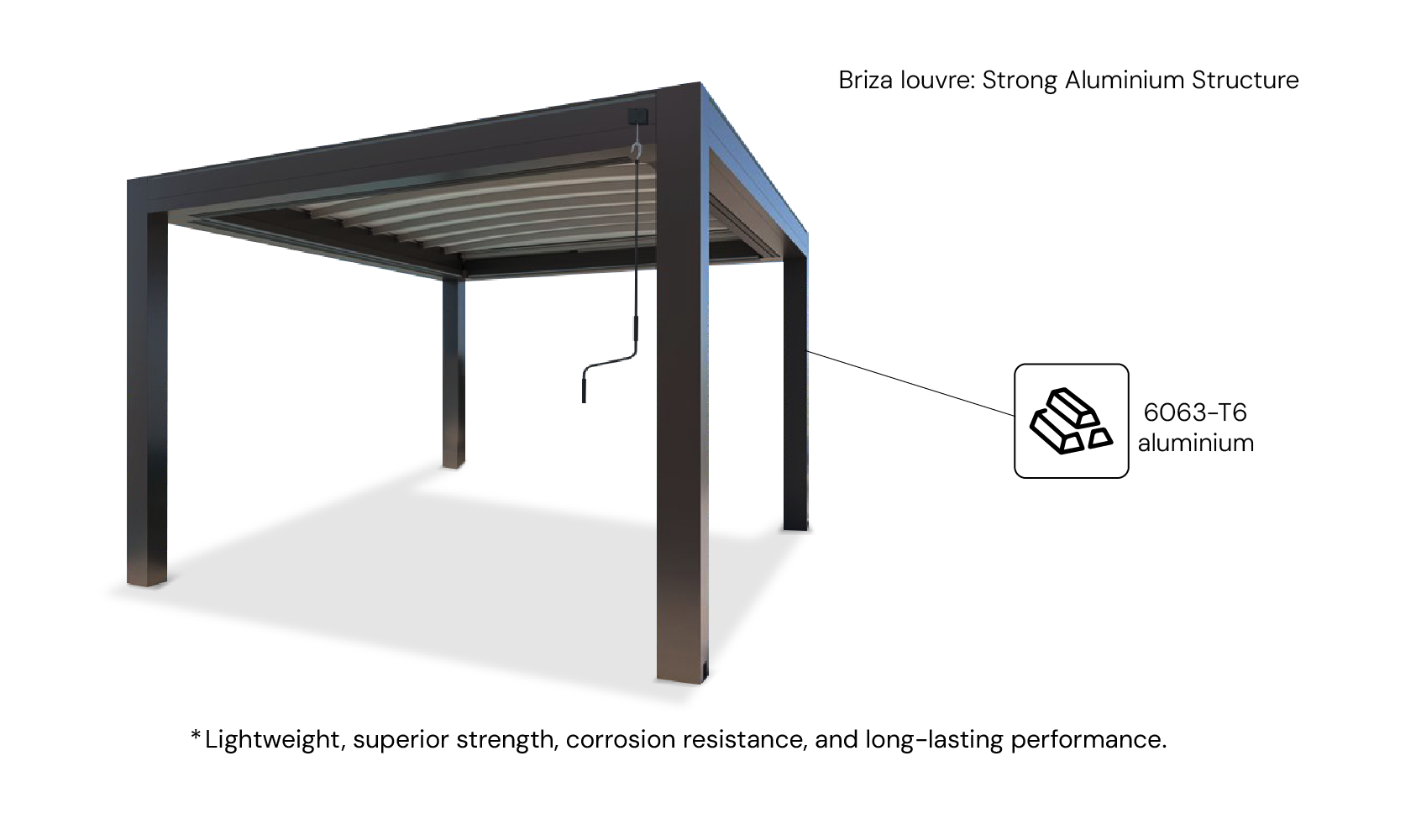 The Briza Louvre is built from structural-grade 6063-T6 aluminium, a material renowned for its superior strength-to-weight ratio. The T6 tempering process heat-treats the aluminium, giving it impressive hardness and stability without adding unnecessary bulk. This ensures the frame and blades stay rigid, resisting bending or warping even during strong winds or frequent use. Unlike steel, aluminium will not rust, meaning its strength and appearance remain intact for years. Combined with a durable powder-coated finish, Briza delivers a sleek, modern design that performs reliably in every season with minimal maintenance.