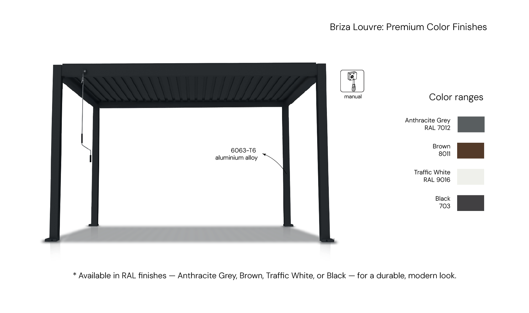 The Briza Louvre comes in a premium selection of durable, weather-resistant finishes designed to complement any outdoor space. Choose from Anthracite Grey (RAL 7012), Brown (RAL 8011), or Traffic White (RAL 9016), all featuring a smooth finish for a clean, contemporary look. For a striking contrast, Black (703) is offered with a microstructure finish for the frame or a smooth finish for the blades. These high-quality coatings not only enhance the visual appeal of your pergola but also provide long-lasting protection against fading, corrosion, and harsh weather conditions.