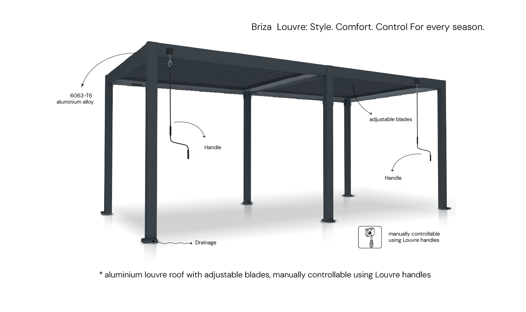 Experience outdoor living your way with the Briza Louvre. Crafted from durable 6063-T6 aluminium alloy, this sleek structure features adjustable blades that you can control effortlessly using precision-designed handles. No motors, no wiring — just smooth manual operation to fine-tune sun, shade, and airflow. Integrated drainage keeps your space dry, while its clean, modern design makes it ideal for patios, decks, and garden spaces. Built for style, strength, and year-round comfort.