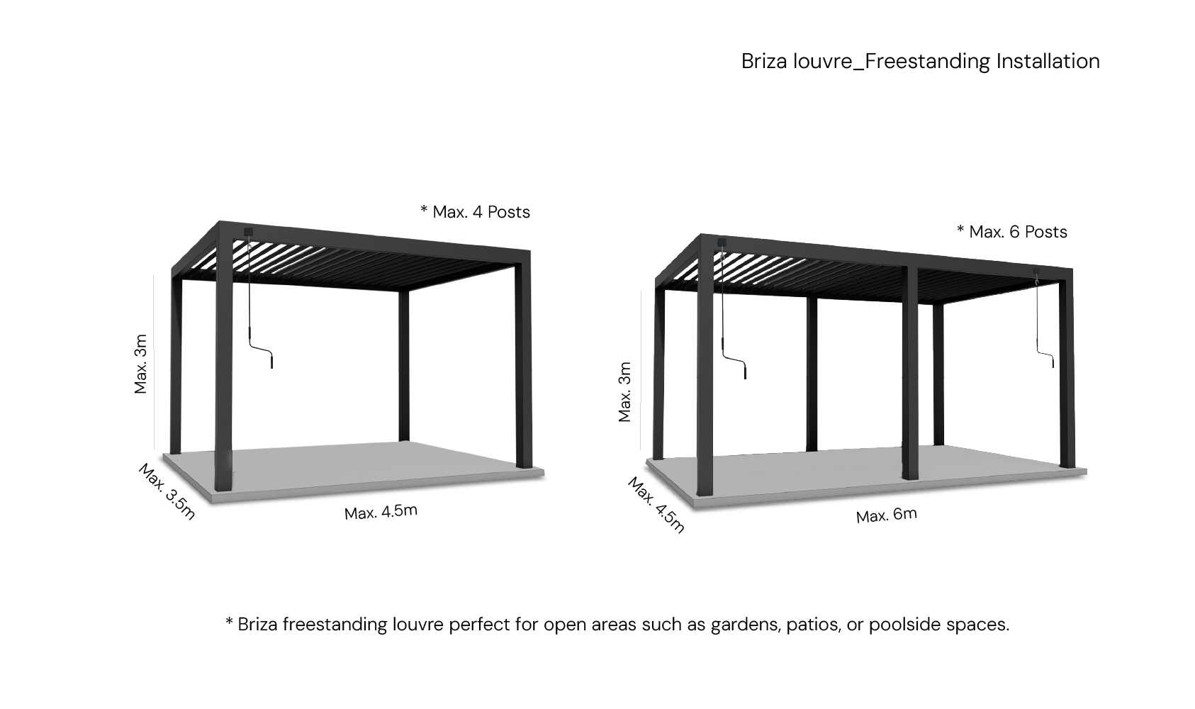 Create the perfect outdoor retreat with the Briza Manual Louvre. Designed as a freestanding structure, it brings shade and airflow control to patios, poolsides, or open garden spaces — no walls or wiring required. Its sleek, modern design defines your space beautifully, while its expandable configuration covers larger areas with ease. Built for durability and year-round use, Briza offers a simple, hands-on way to enjoy comfort, style, and protection in any season.